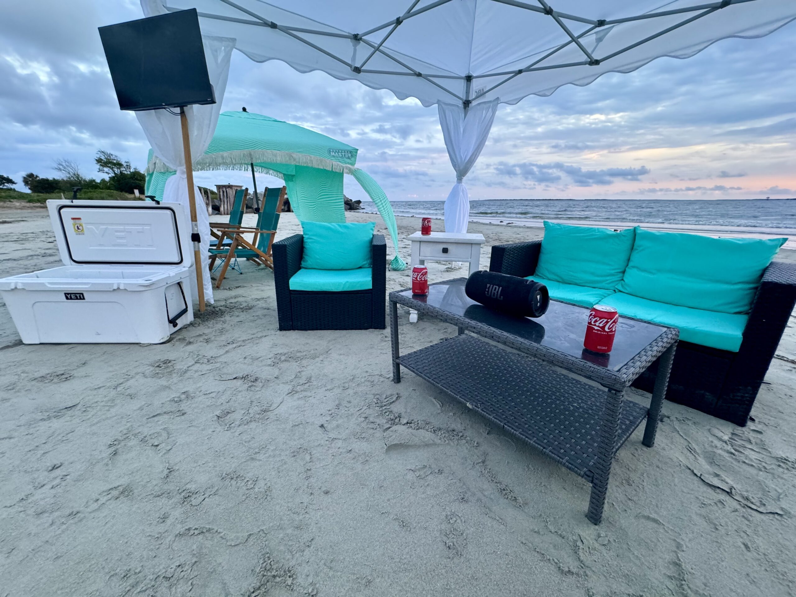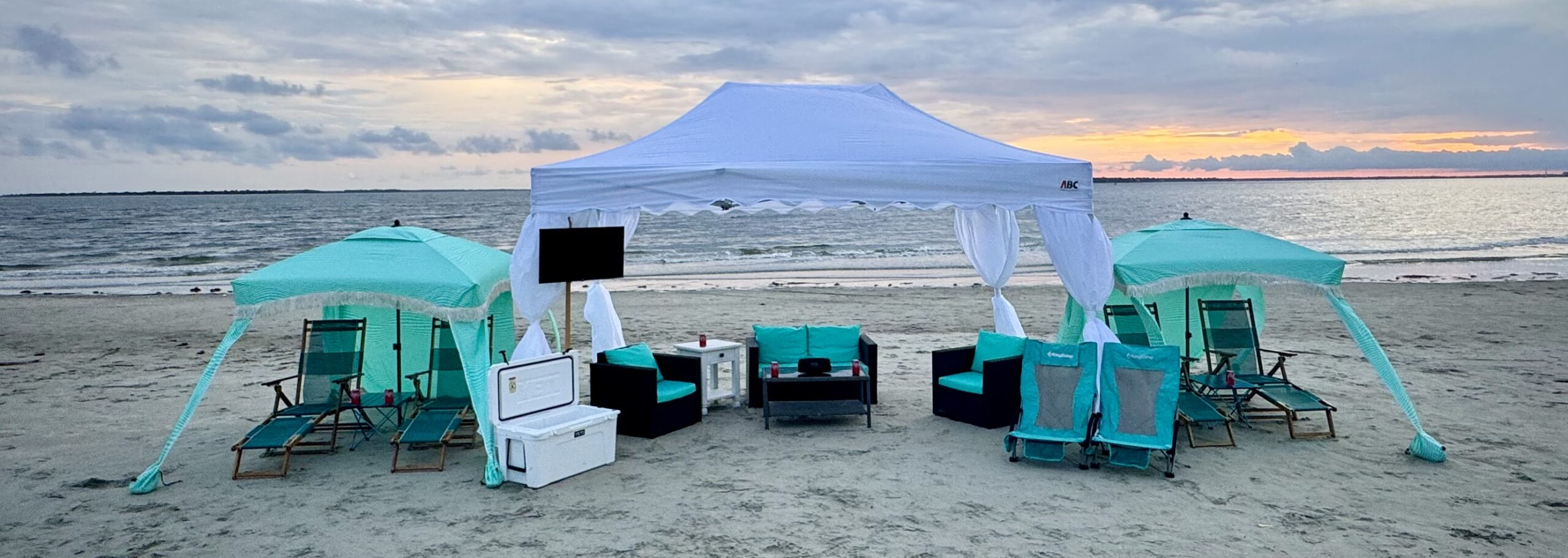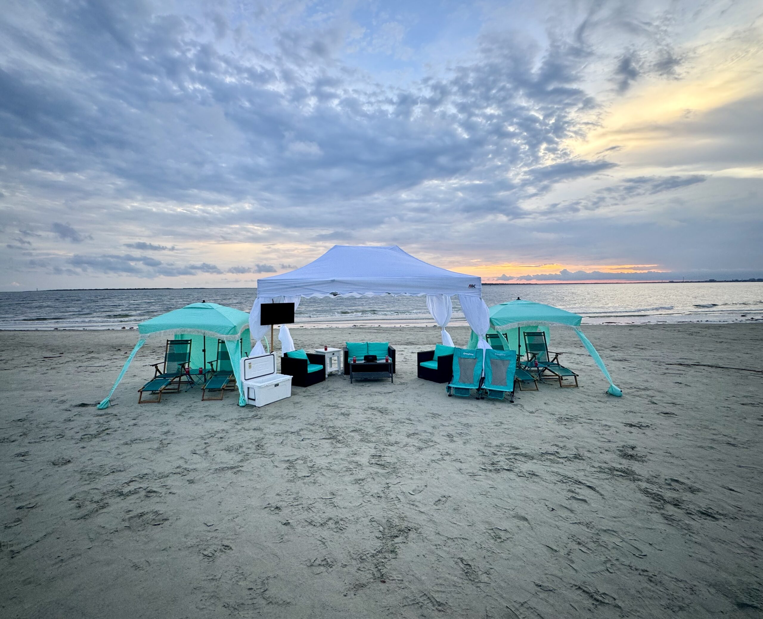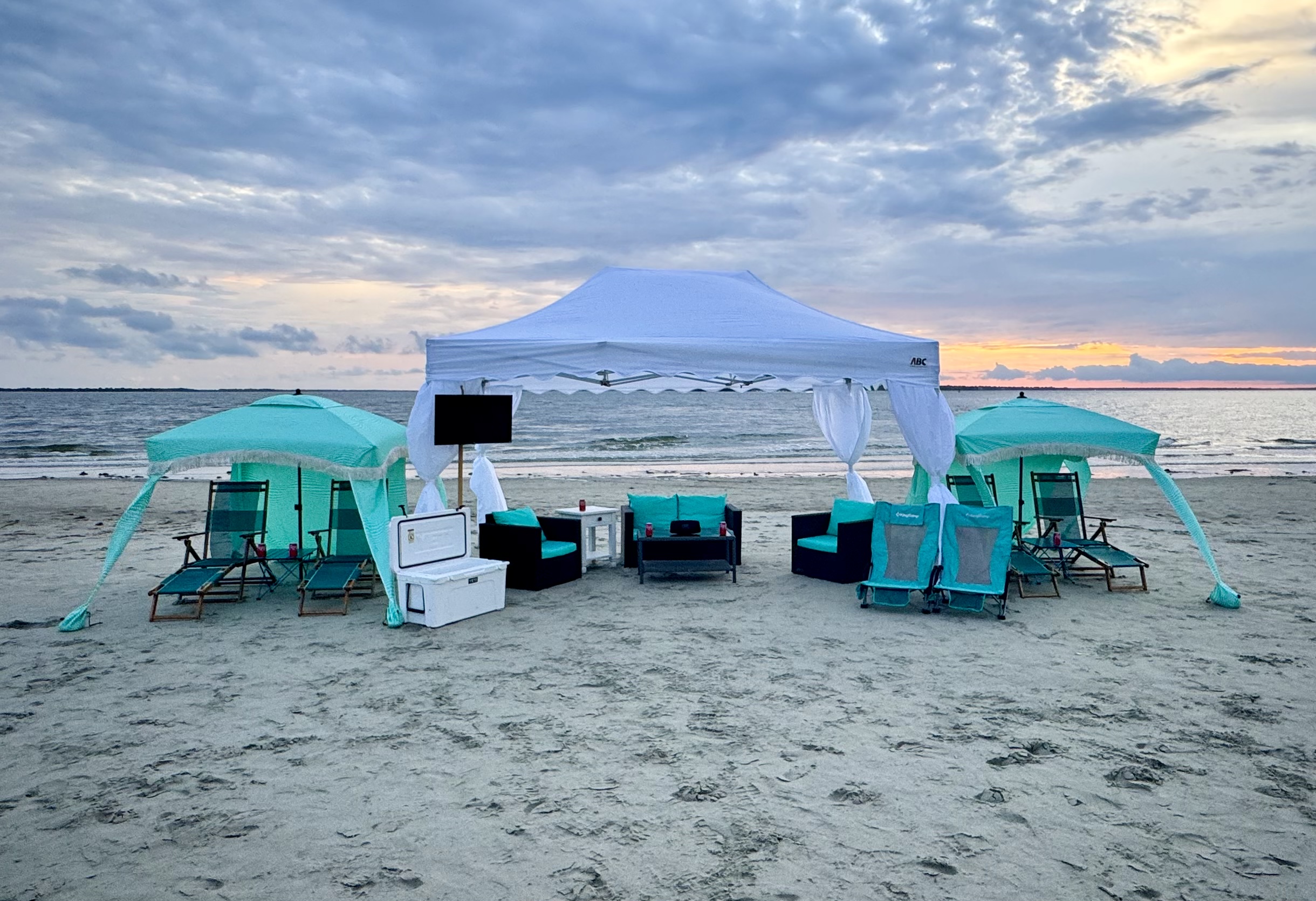Elevate your beach experience with our spacious 15’x10’ cabana. Perfect for larger groups, this luxurious cabana offers ample shade, comfortable seating, and premium amenities to ensure a relaxing and memorable day by the sea. Enjoy the ultimate in comfort and style with Chucky’s Cabana Club.