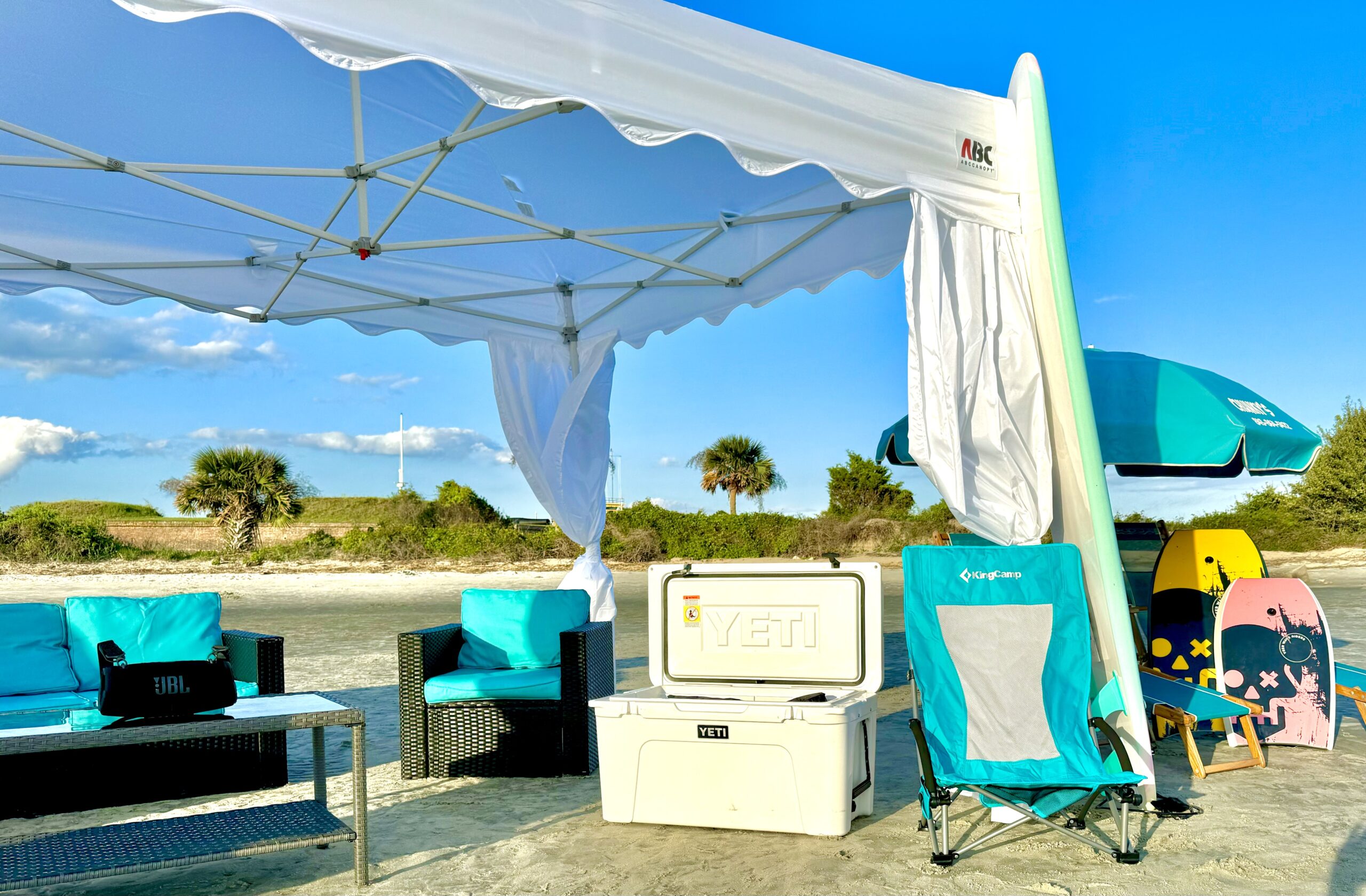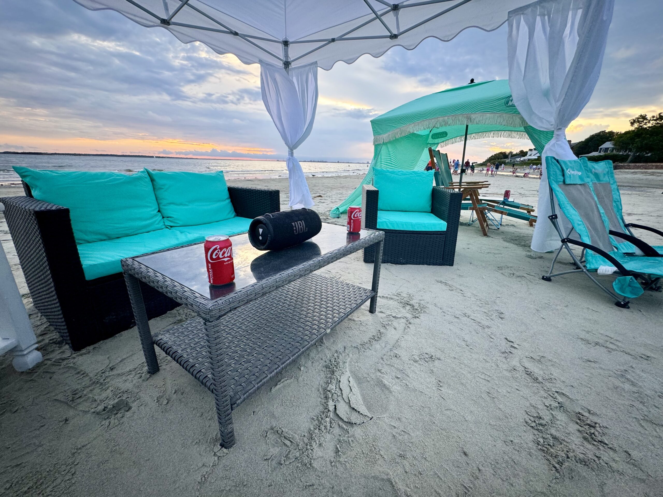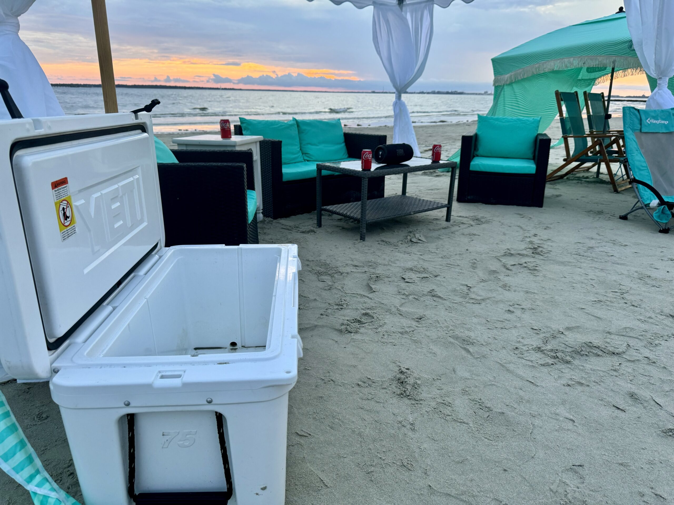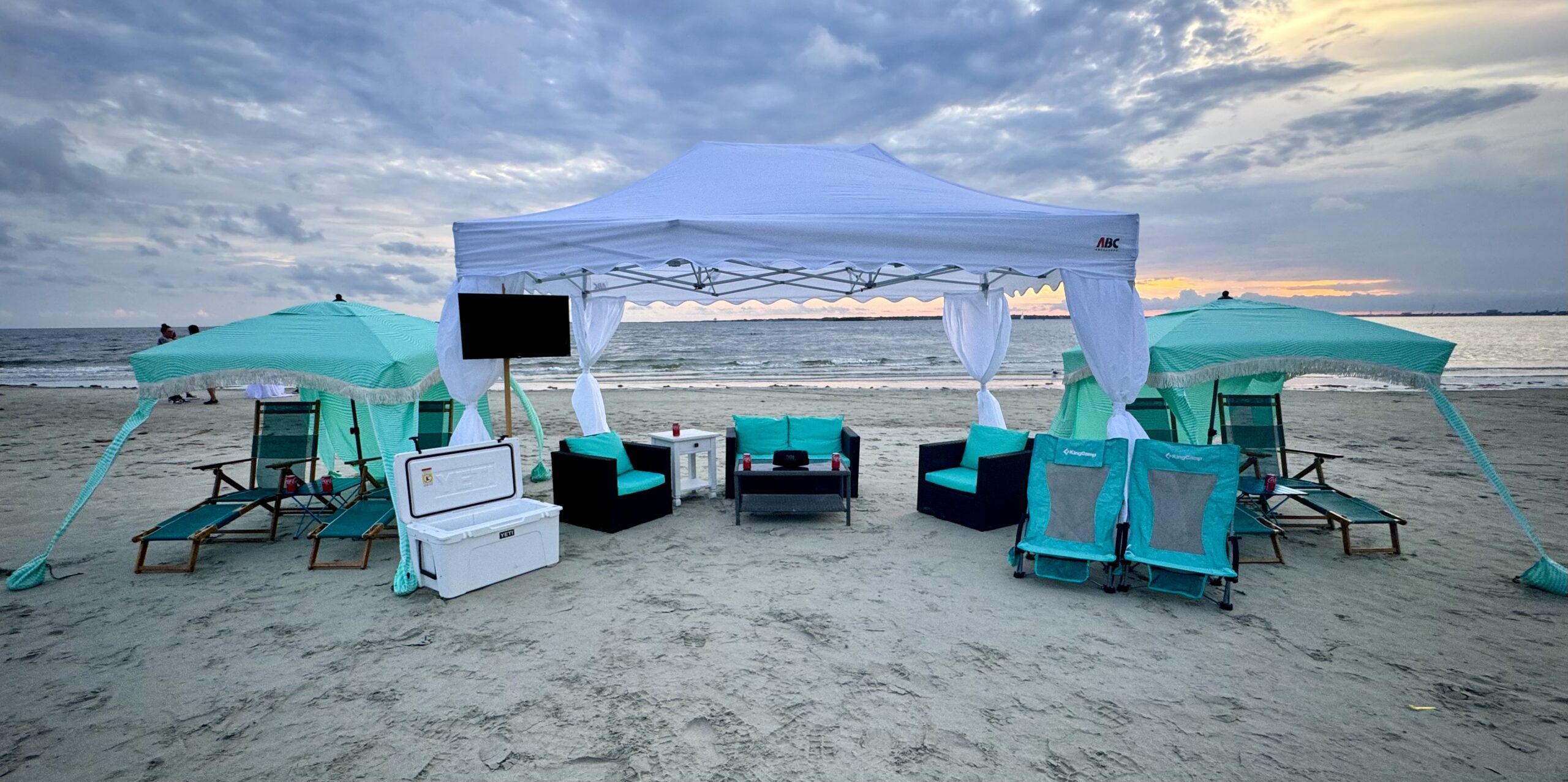 Elevate your beach experience with our spacious 15’x10’ cabana. Perfect for larger groups, this luxurious cabana offers ample shade, comfortable seating, and premium amenities to ensure a relaxing and memorable day by the sea. Enjoy the ultimate in comfort and style with Chucky’s Cabana Club.