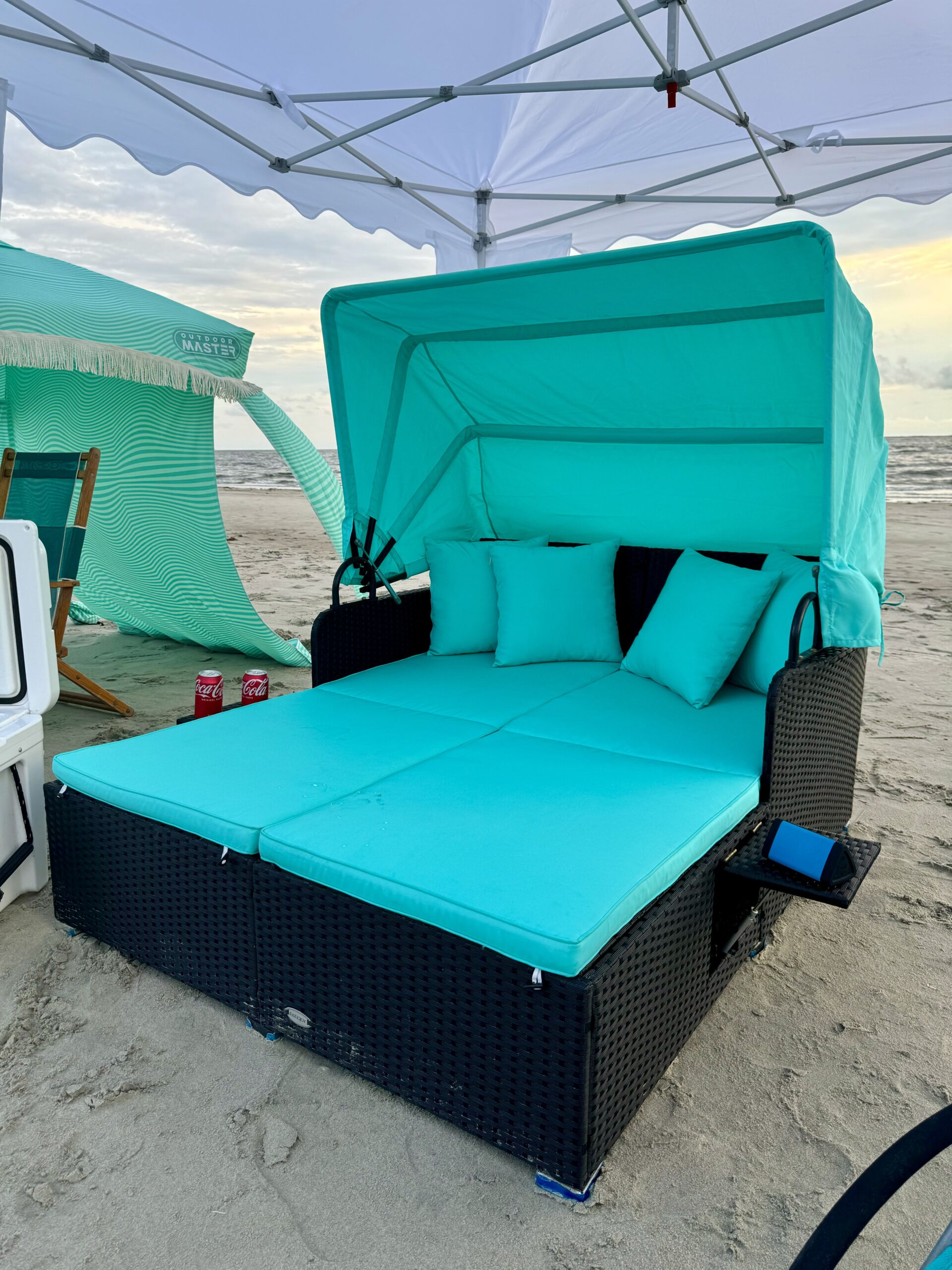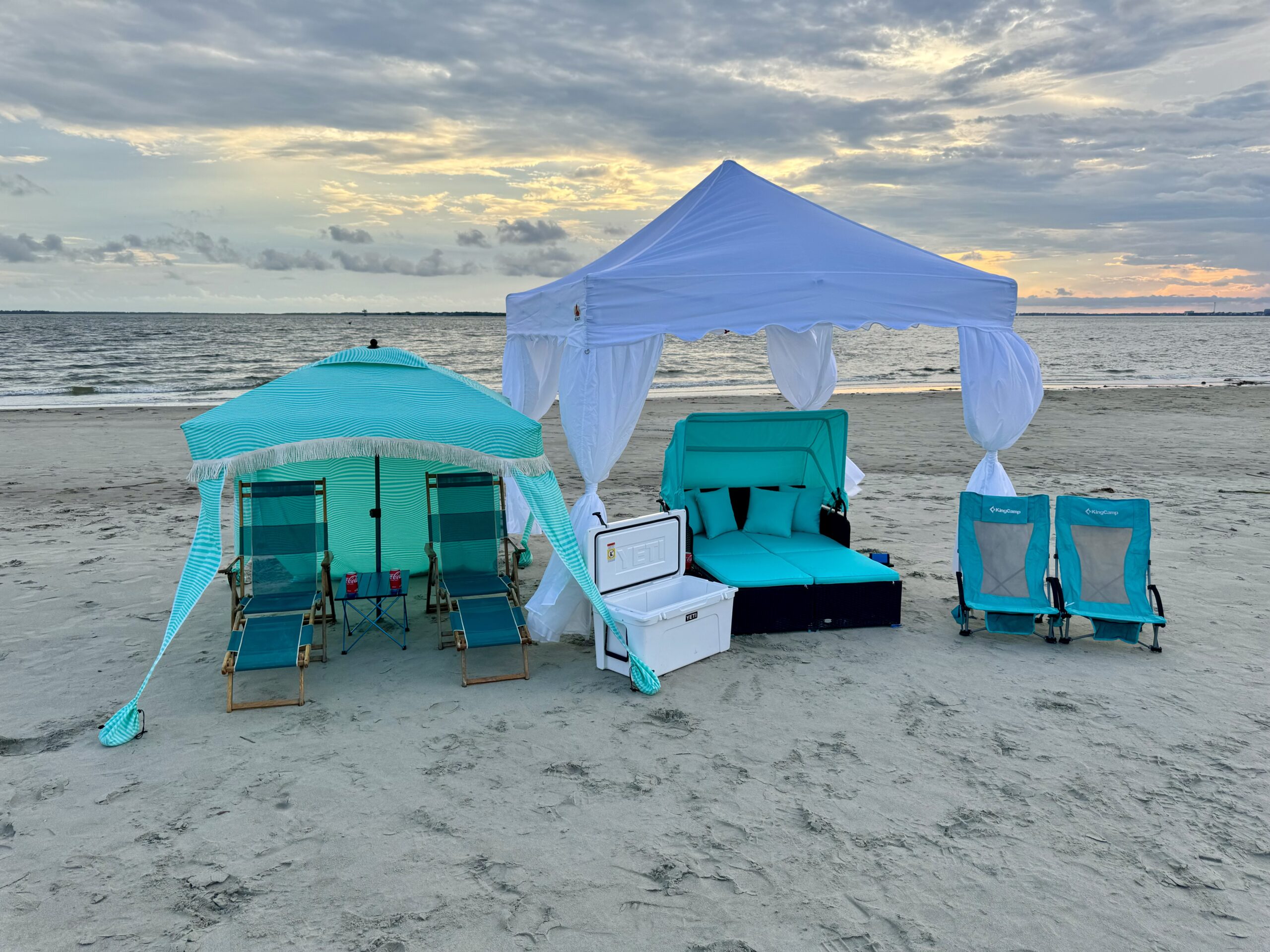 Elevate your beach experience with our spacious 15’x10’ cabana. Perfect for larger groups, this luxurious cabana offers ample shade, comfortable seating, and premium amenities to ensure a relaxing and memorable day by the sea. Enjoy the ultimate in comfort and style with Chucky’s Cabana Club.